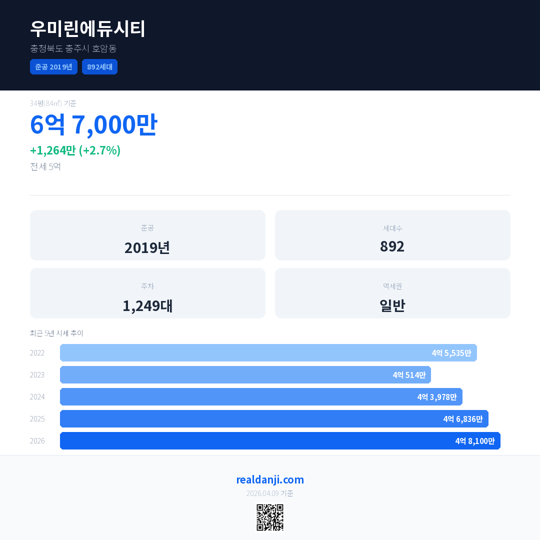 우미린에듀시티 국민평형 기준 2026년 평균 거래가는 4억 8,100만으로, 전년 대비 2.7% 상승 했습니다.