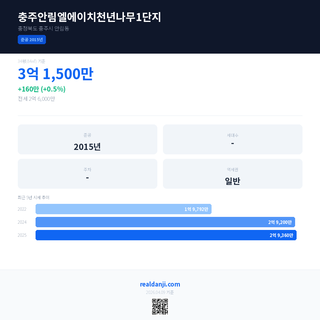 충주안림엘에이치천년나무1단지 최근 거래가는 3억 1,500만입니다. (2025-10)