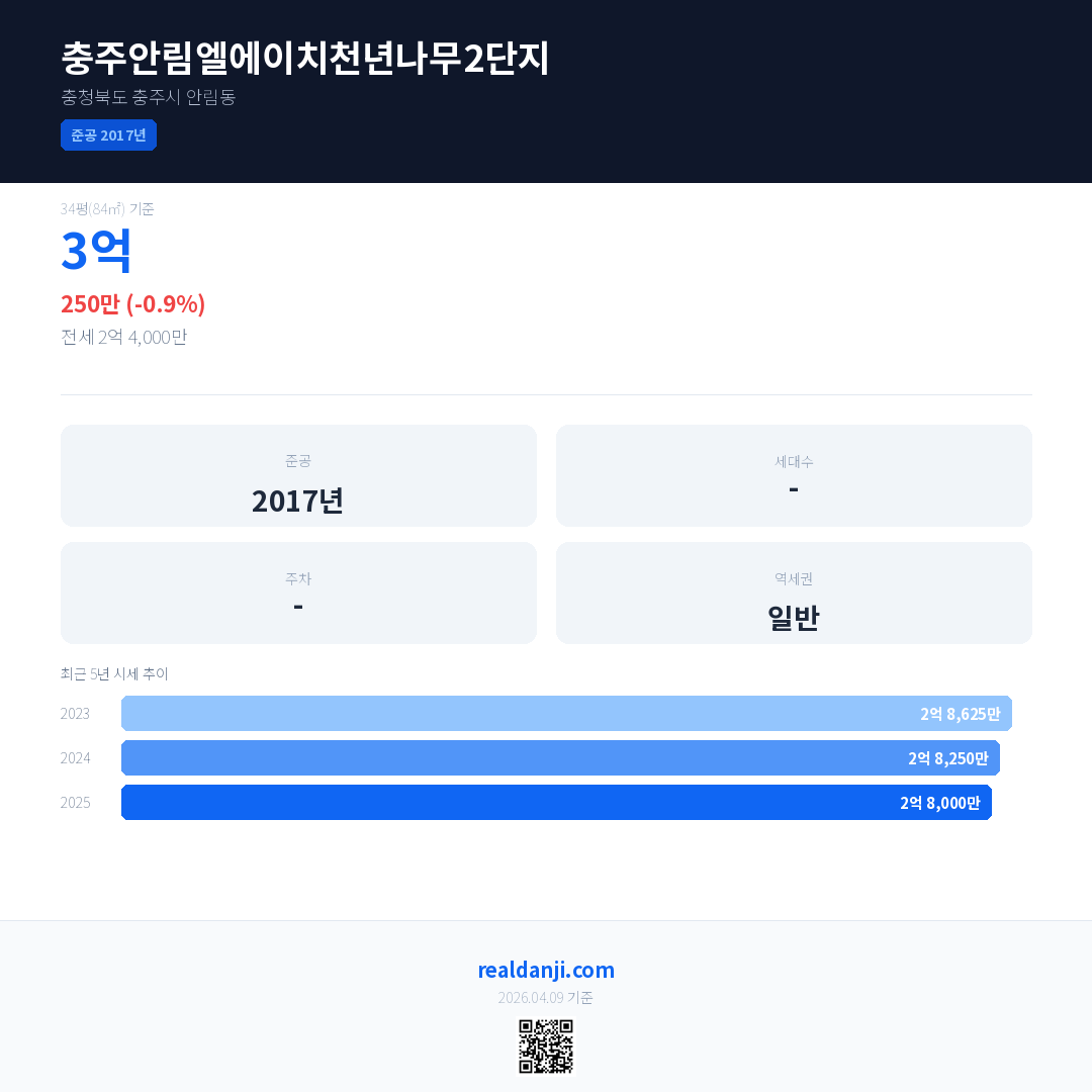 충주안림엘에이치천년나무2단지 최근 거래가는 3억입니다. (2025-12)