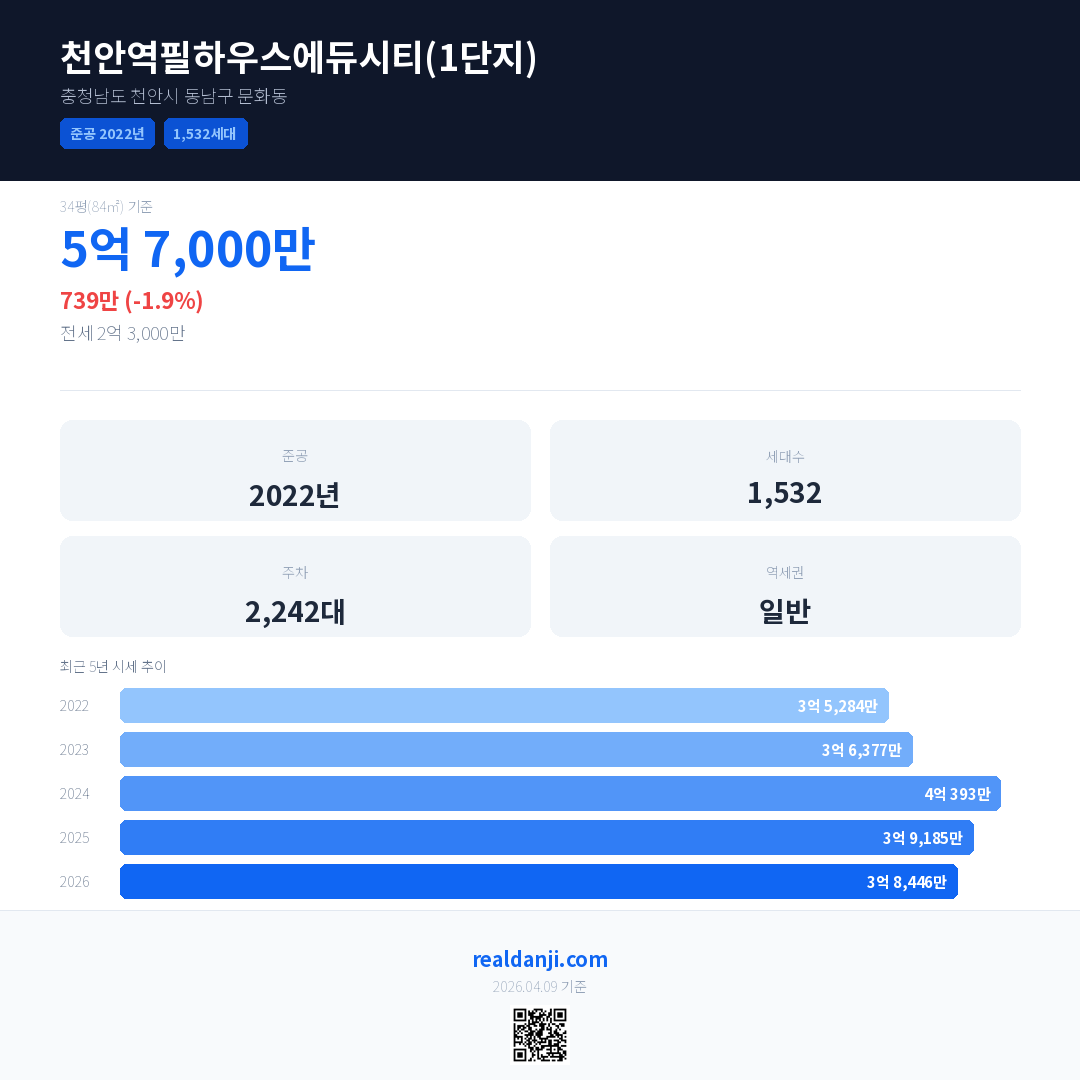 천안역필하우스에듀시티(1단지) 국민평형 기준 2026년 평균 거래가는 3억 8,446만으로, 전년 대비 1.9% 하락 했습니다.