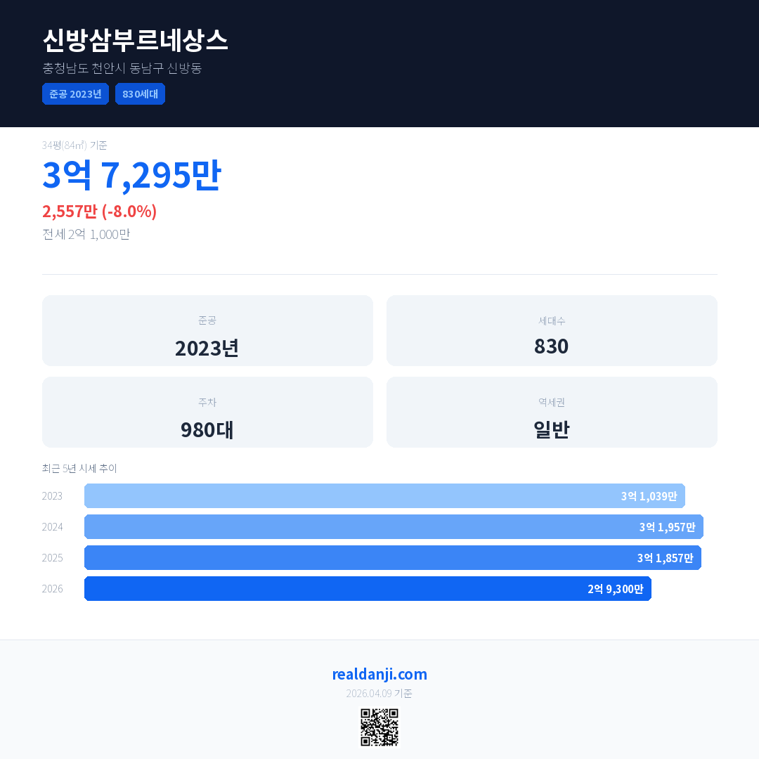 신방삼부르네상스은(는) 2023년에 준공되었으며, 현재 3년차입니다. 총 830세대 규모입니다.