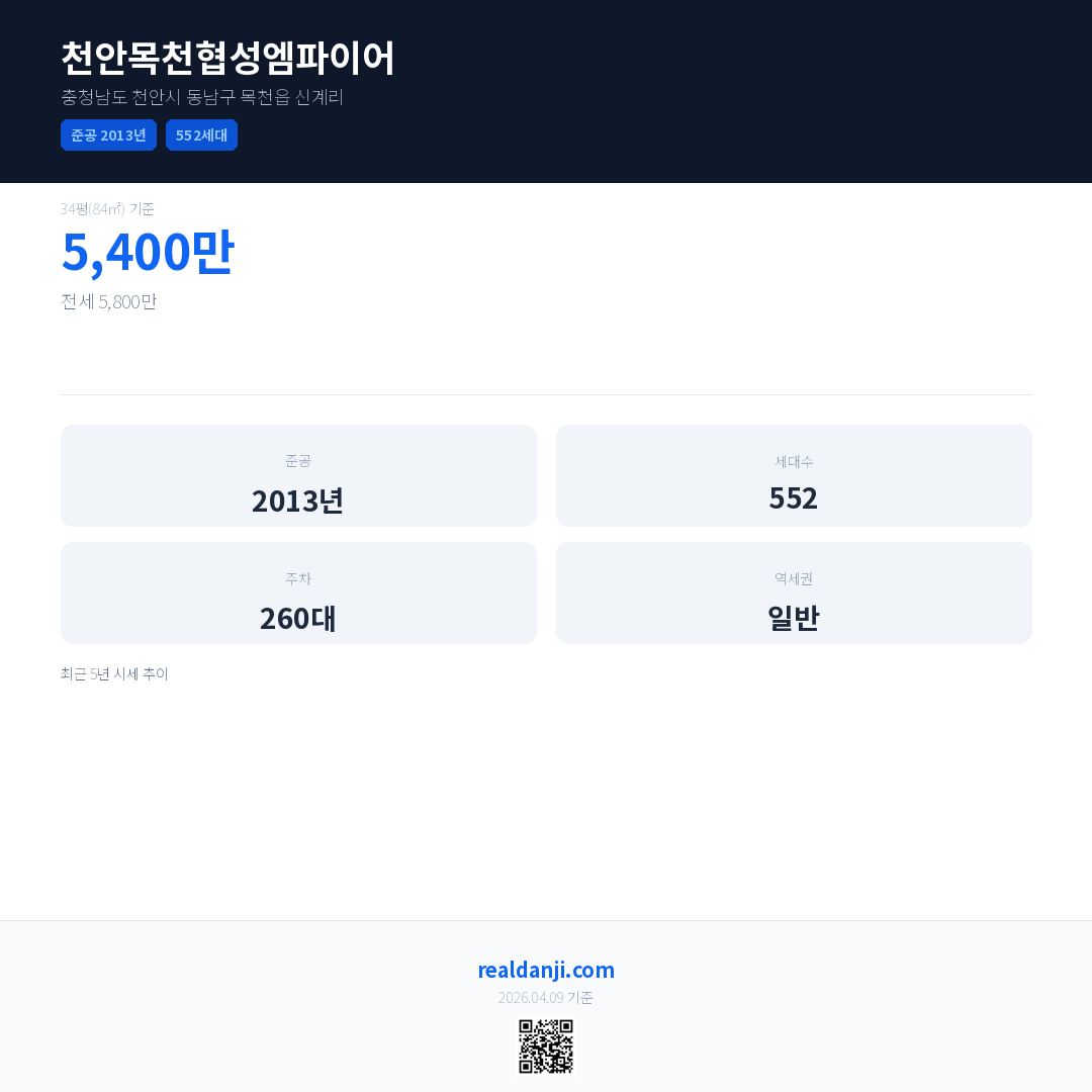 천안목천협성엠파이어은(는) 2013년에 준공되었으며, 현재 13년차입니다. 총 552세대 규모입니다.