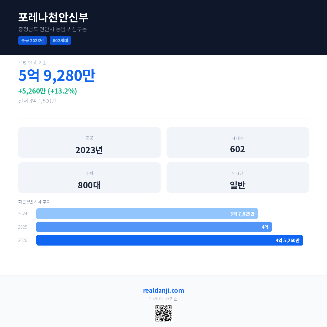 포레나천안신부 국민평형 기준 2026년 평균 거래가는 4억 5,260만으로, 전년 대비 13.2% 상승 했습니다.