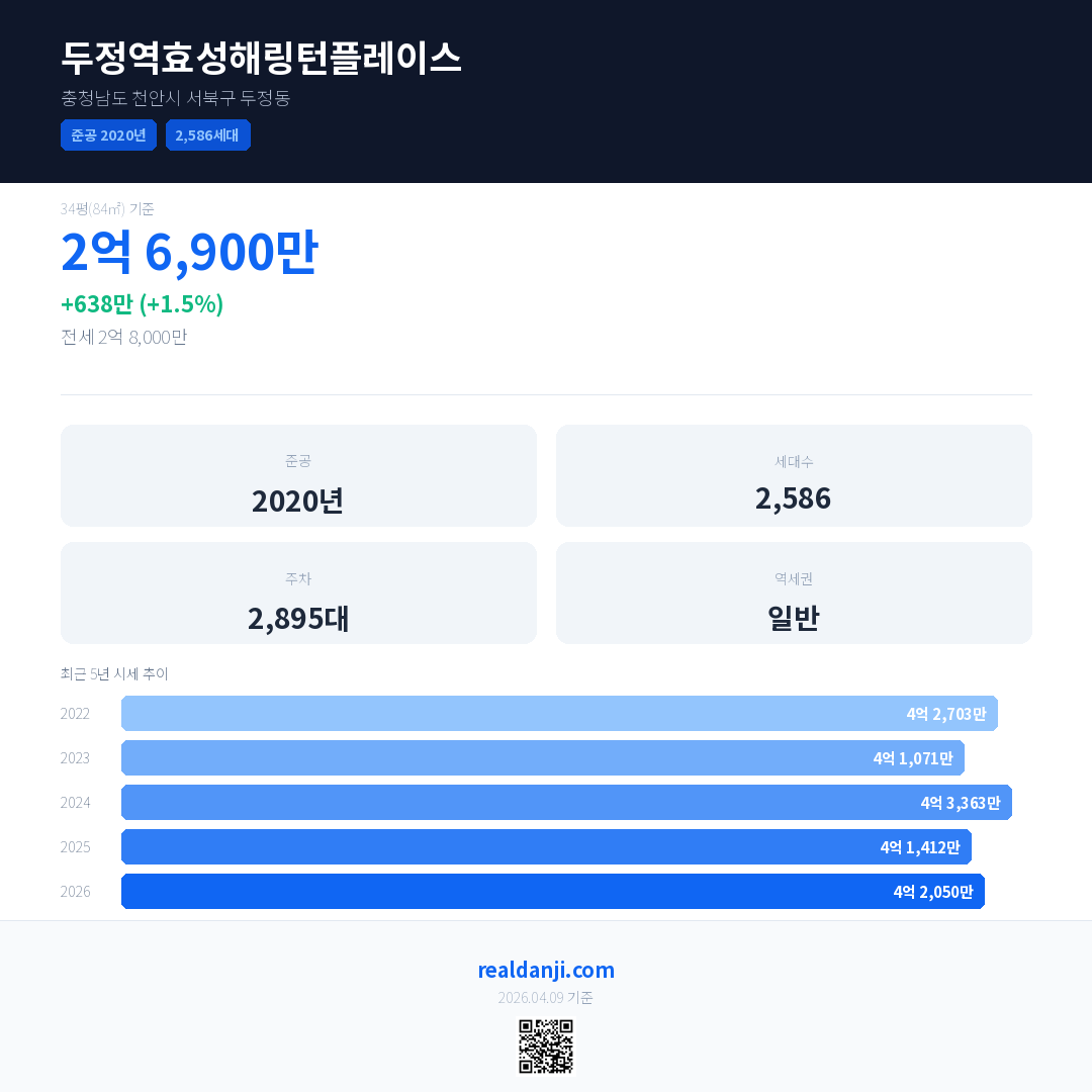 두정역효성해링턴플레이스 국민평형 기준 2026년 평균 거래가는 4억 2,050만으로, 전년 대비 1.5% 상승 했습니다.