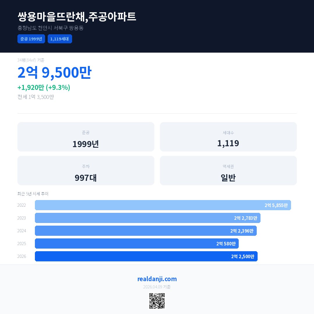 쌍용마을뜨란채,주공아파트 국민평형 기준 2026년 평균 거래가는 2억 2,500만으로, 전년 대비 9.3% 상승 했습니다.