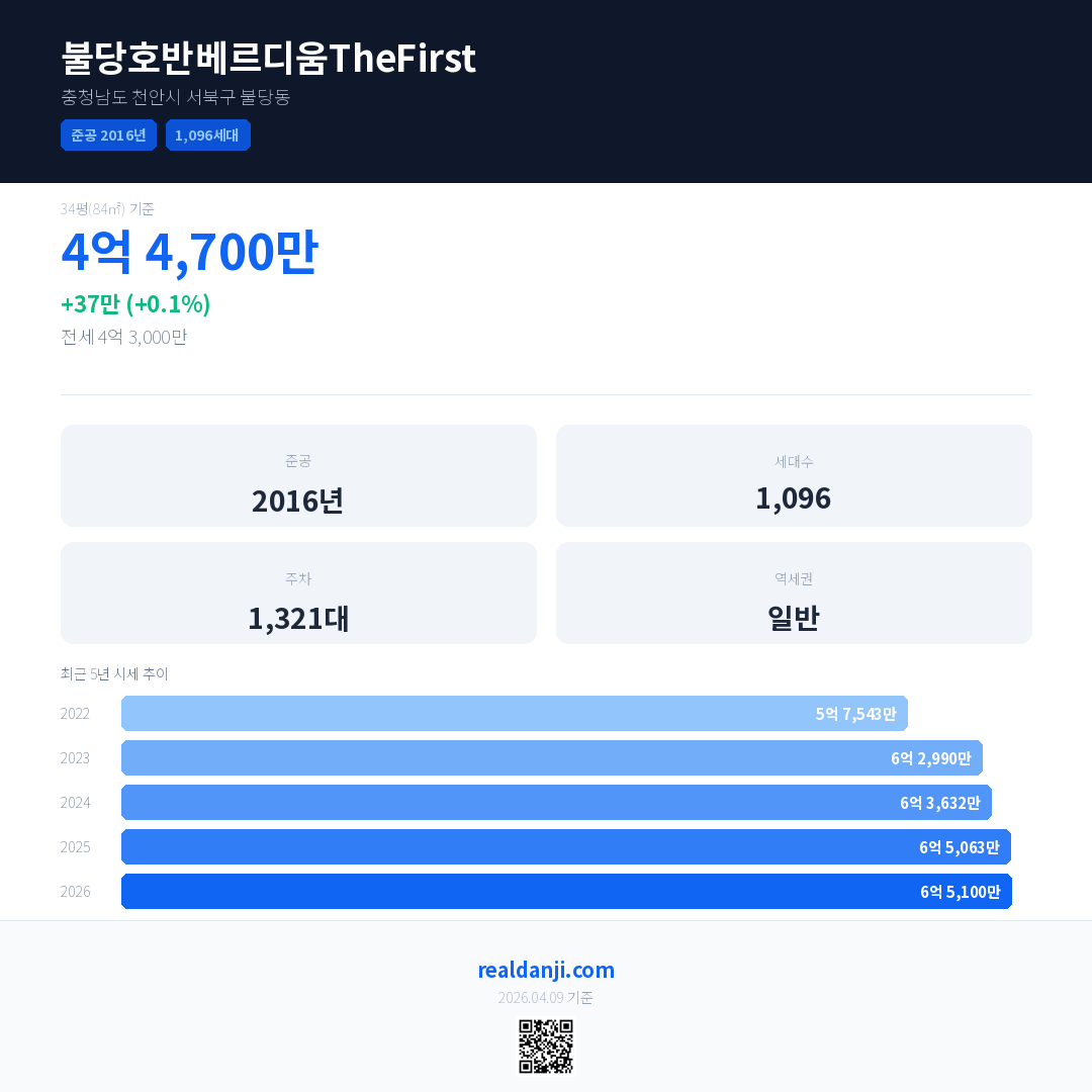 불당호반베르디움TheFirst 국민평형 기준 2026년 평균 거래가는 6억 5,100만으로, 전년 대비 0.1% 상승 했습니다.