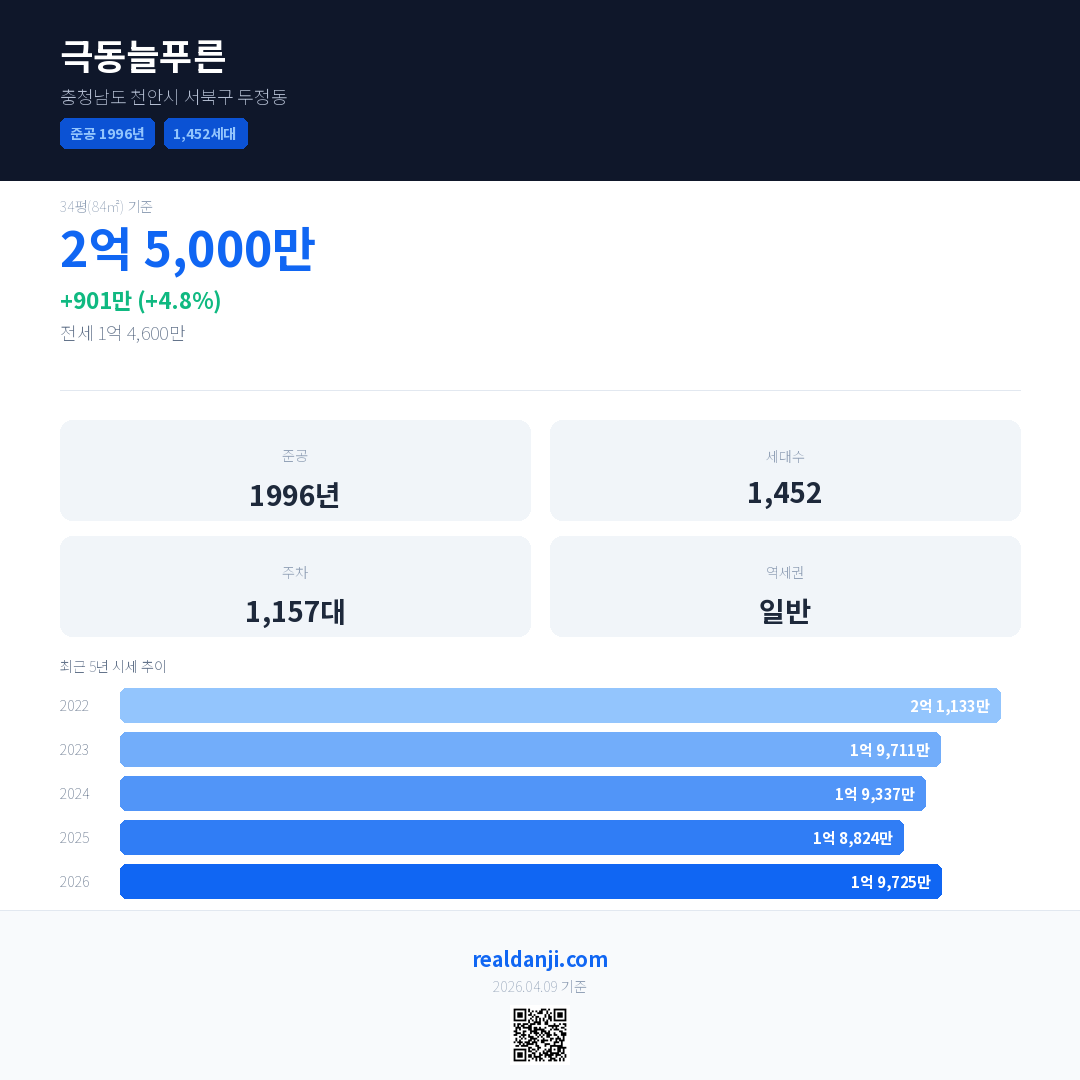 극동늘푸른 국민평형 기준 2026년 평균 거래가는 1억 9,725만으로, 전년 대비 4.8% 상승 했습니다.