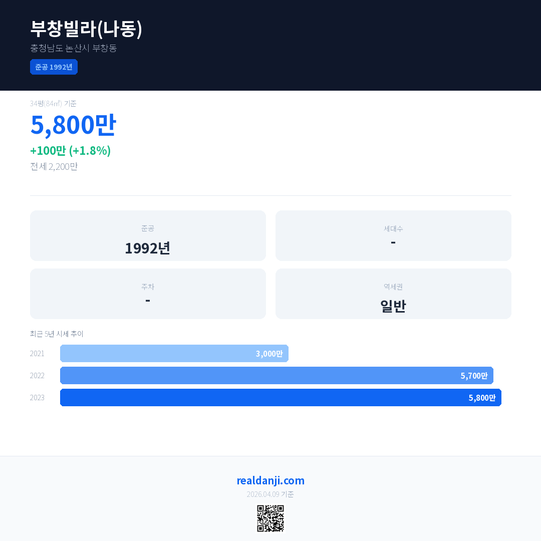 부창빌라(나동) 국민평형 기준 2023년 평균 거래가는 5,800만으로, 전년 대비 1.8% 상승 했습니다.