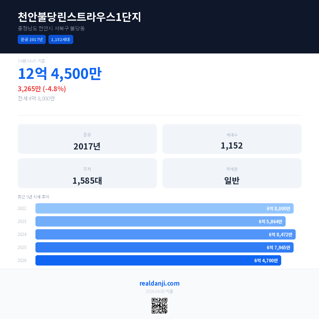 천안불당린스트라우스1단지 국민평형 기준 2026년 평균 거래가는 6억 4,700만으로, 전년 대비 4.8% 하락 했습니다.