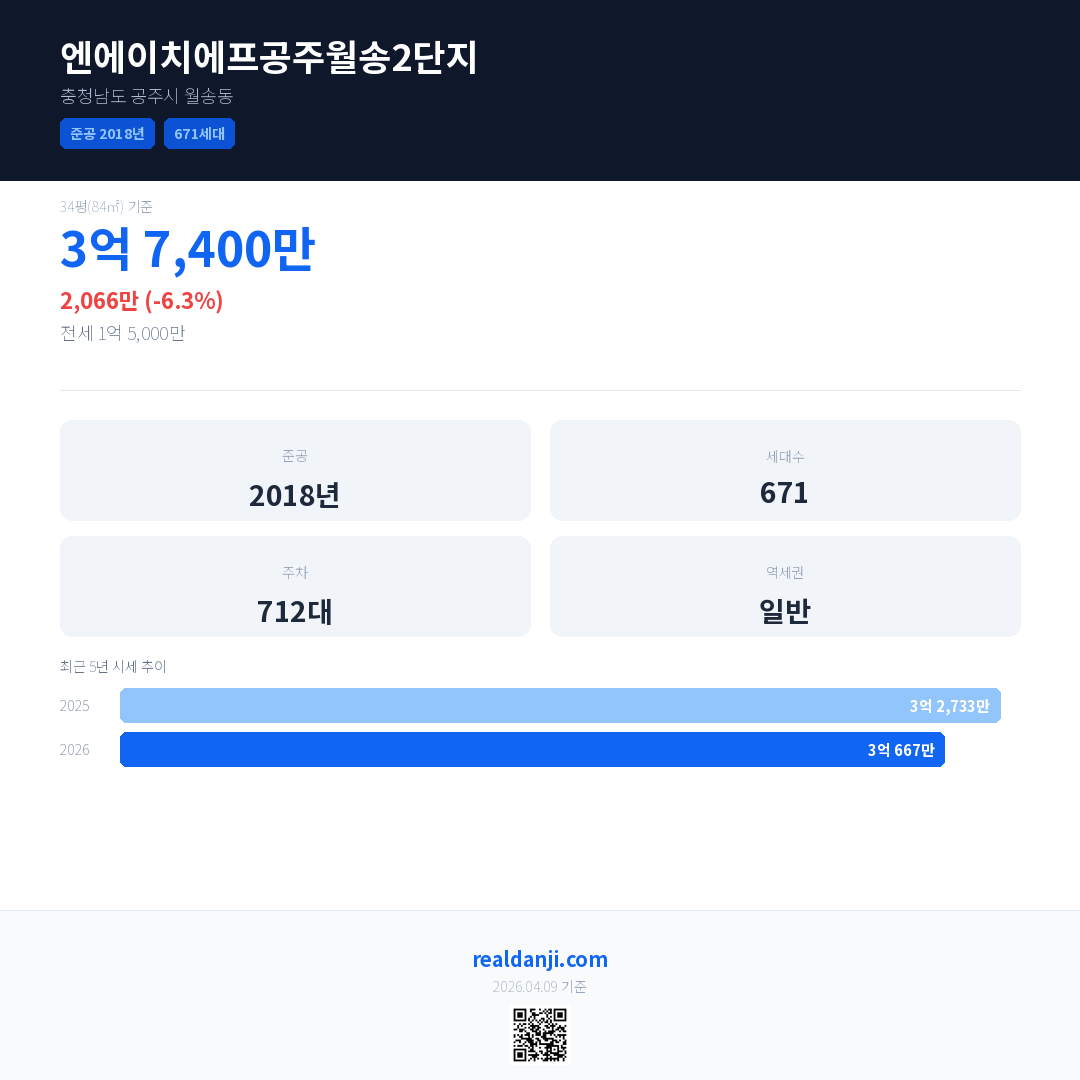 엔에이치에프공주월송2단지 국민평형 기준 2026년 평균 거래가는 3억 667만으로, 전년 대비 6.3% 하락 했습니다.