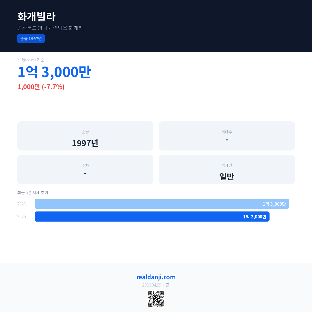 화개빌라 국민평형 기준 2025년 평균 거래가는 1억 2,000만으로, 전년 대비 7.7% 하락 했습니다.