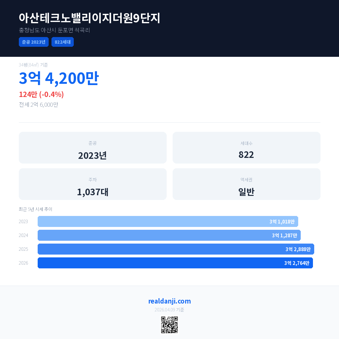아산테크노밸리이지더원9단지 최근 거래가는 3억 7,000만입니다. (2026-04)
