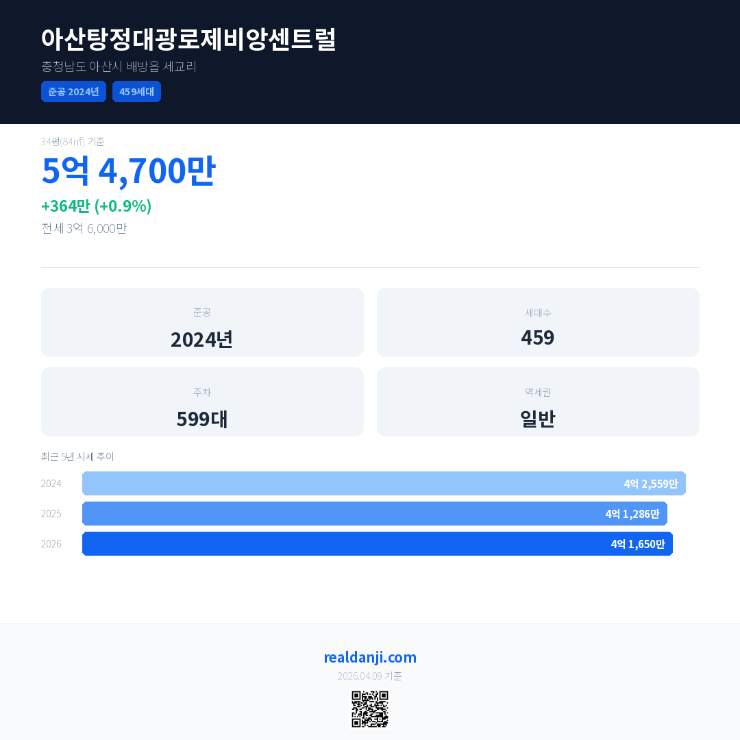 아산탕정대광로제비앙센트럴 최근 거래가는 5억 4,700만입니다. (2026-03)
