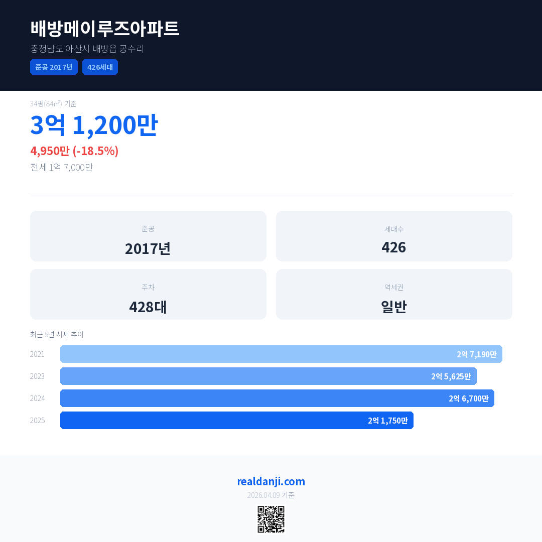 배방메이루즈아파트 국민평형 기준 2025년 평균 거래가는 2억 1,750만으로, 전년 대비 18.5% 하락 했습니다.