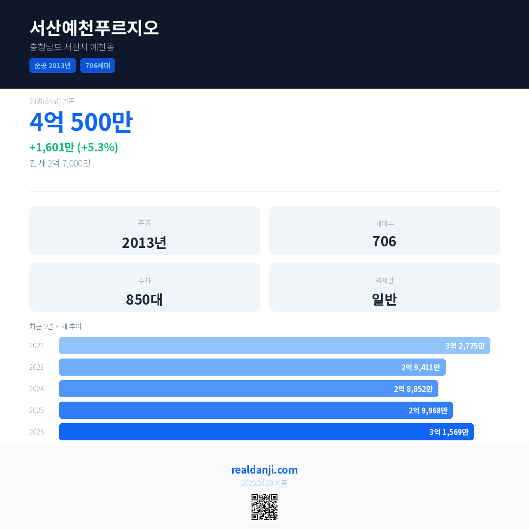 서산예천푸르지오 최근 거래가는 4억 500만입니다. (2026-03)