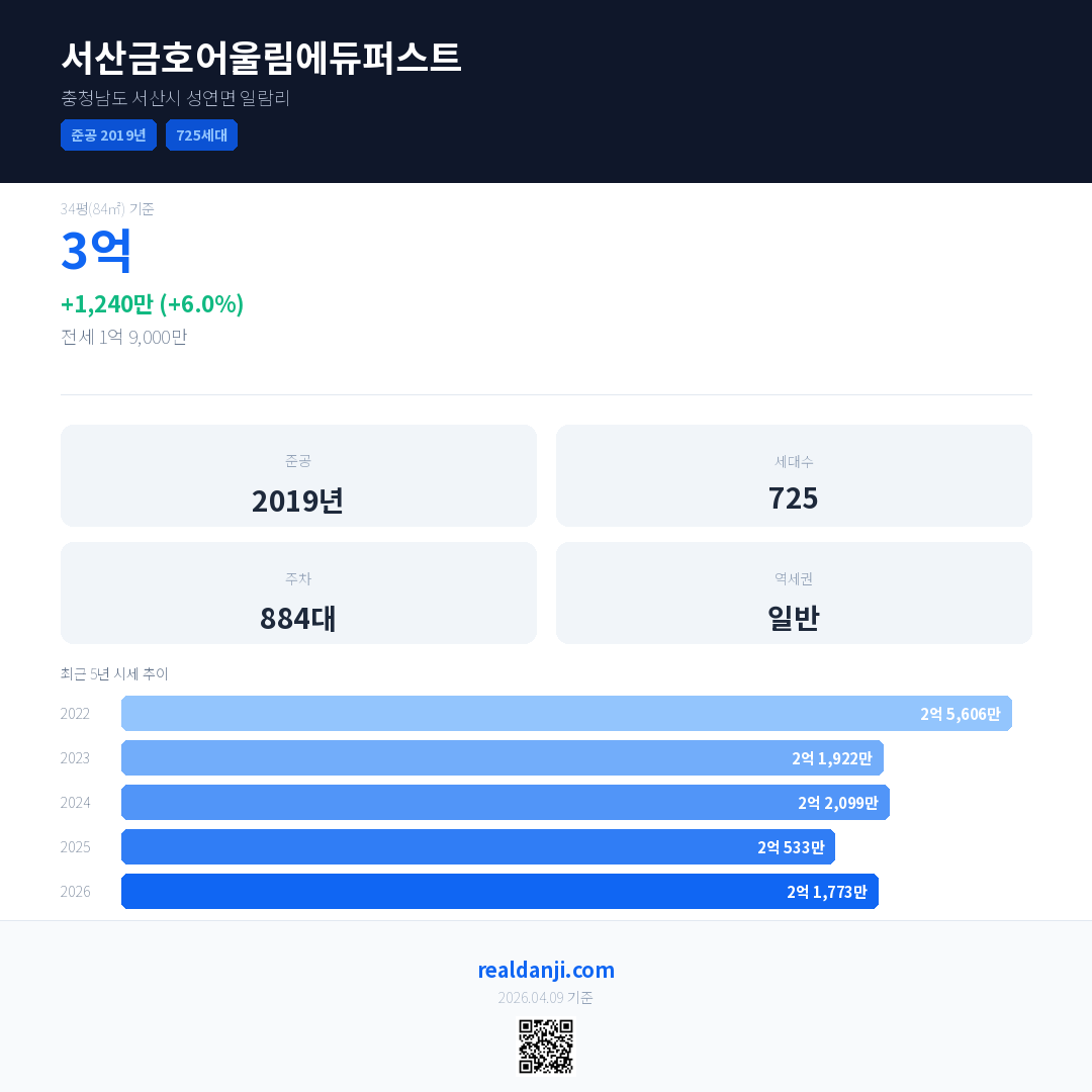 서산금호어울림에듀퍼스트 최근 거래가는 2억 6,000만입니다. (2026-04)
