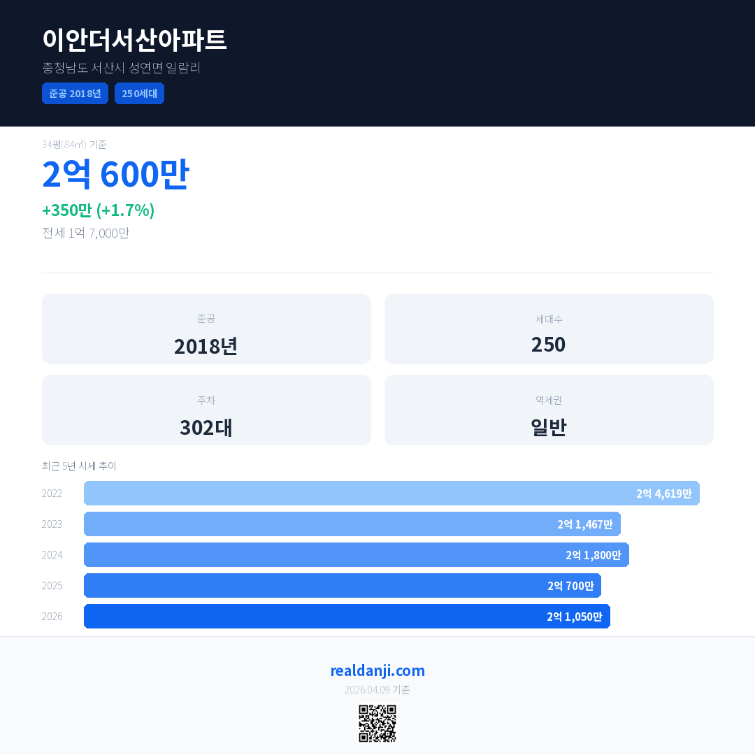 이안더서산아파트 국민평형 기준 2026년 평균 거래가는 2억 1,067만으로, 전년 대비 1.8% 상승 했습니다.