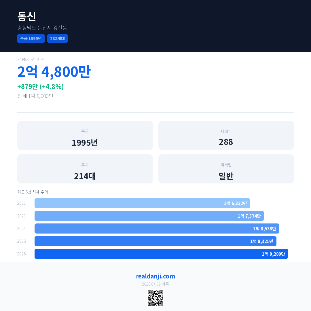 동신 국민평형 기준 2026년 평균 거래가는 1억 9,200만으로, 전년 대비 4.8% 상승 했습니다.