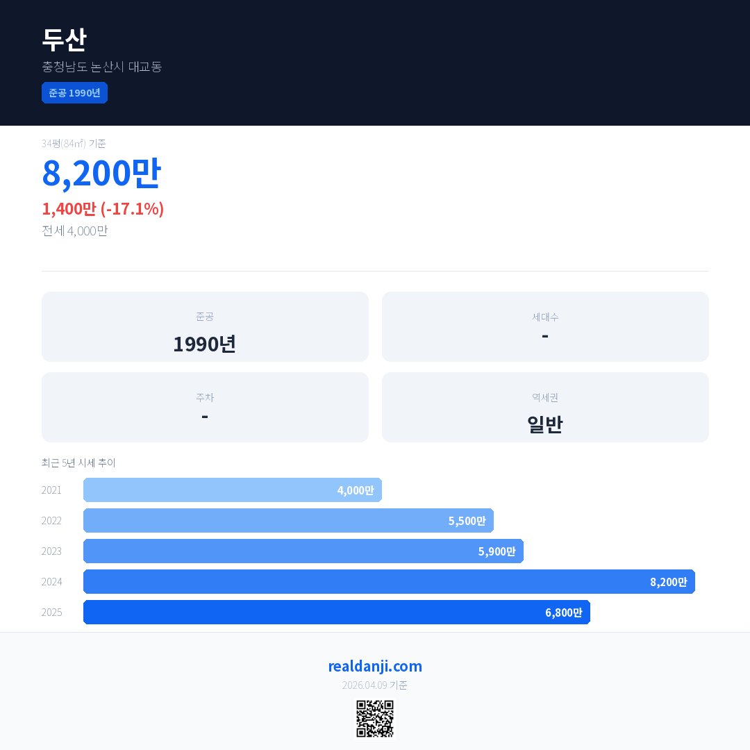 두산 국민평형 기준 2025년 평균 거래가는 6,800만으로, 전년 대비 17.1% 하락 했습니다.