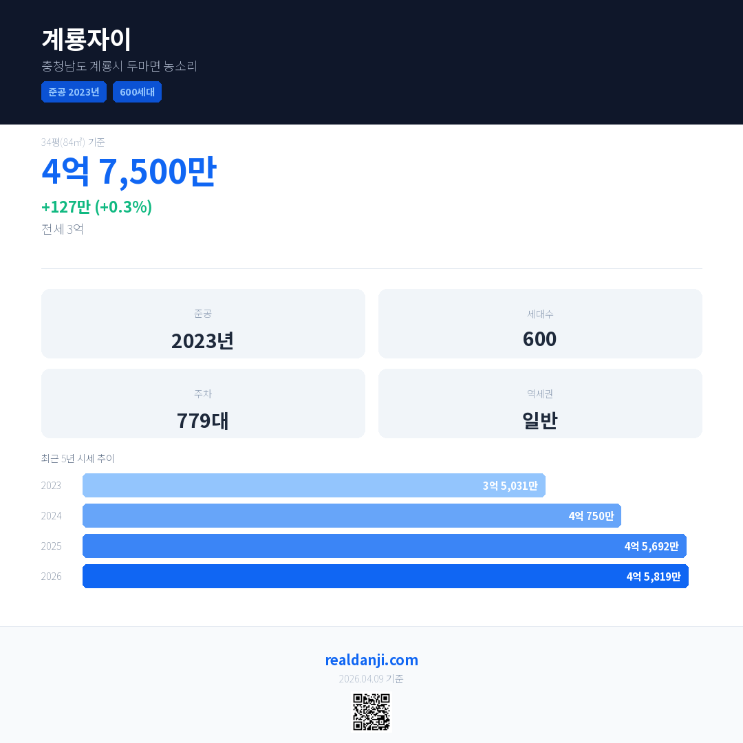 계룡자이 국민평형 기준 2026년 평균 거래가는 4억 5,819만으로, 전년 대비 0.3% 상승 했습니다.