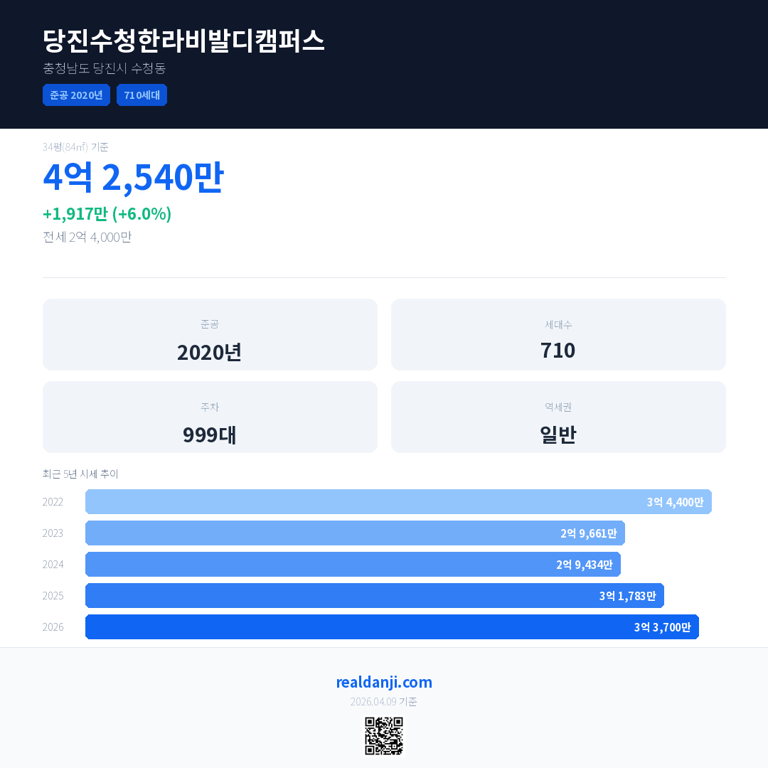 당진수청한라비발디캠퍼스 국민평형 기준 2026년 평균 거래가는 3억 3,700만으로, 전년 대비 6.0% 상승 했습니다.