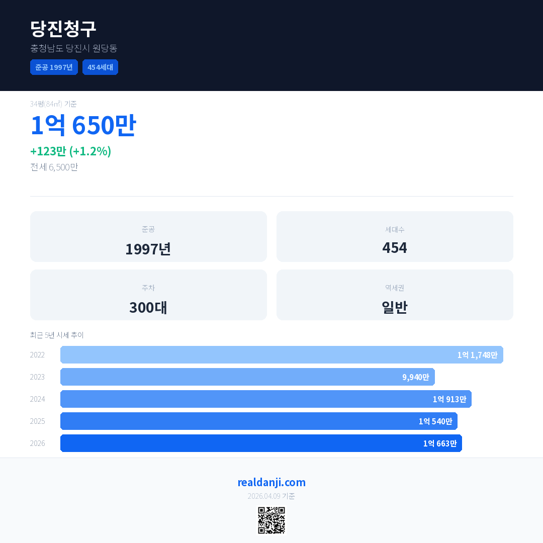당진청구 국민평형 기준 2026년 평균 거래가는 1억 663만으로, 전년 대비 1.2% 상승 했습니다.