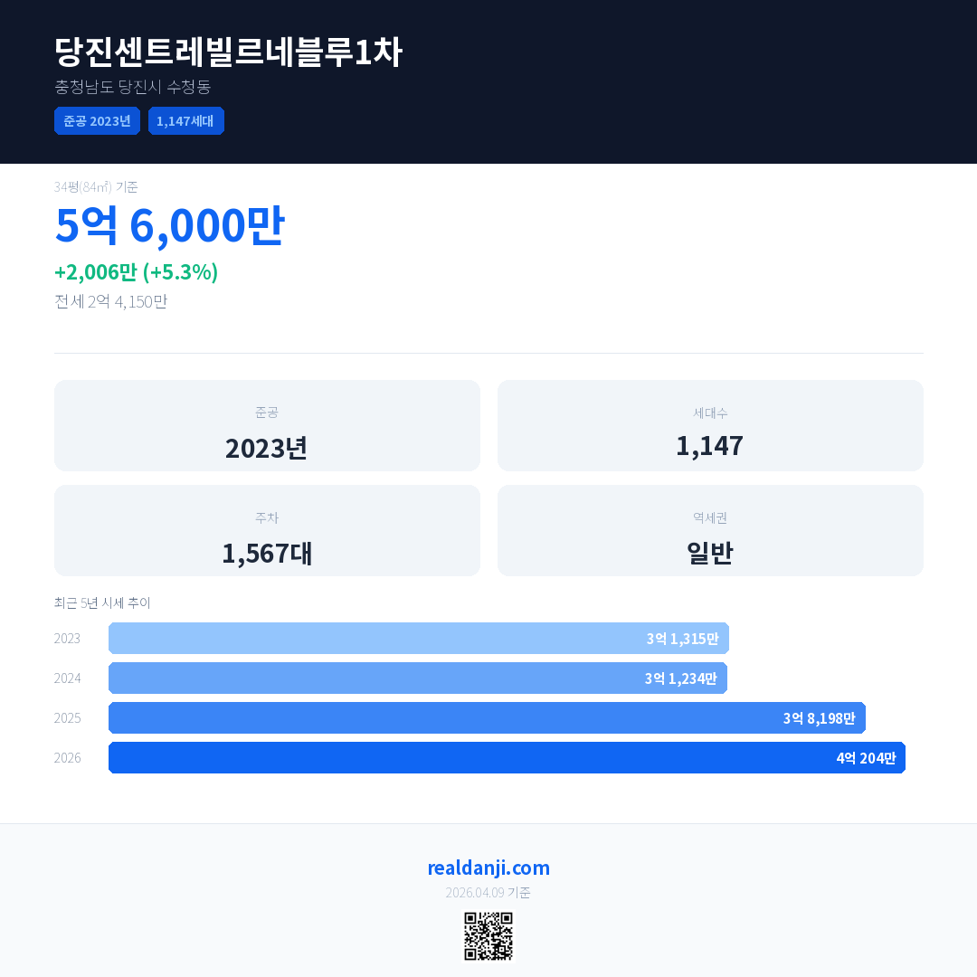 당진센트레빌르네블루1차 국민평형 기준 2026년 평균 거래가는 4억 204만으로, 전년 대비 5.3% 상승 했습니다.