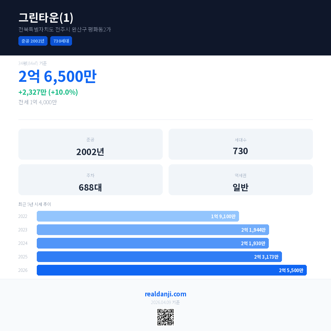 그린타운(1) 국민평형 기준 2026년 평균 거래가는 2억 5,500만으로, 전년 대비 10.0% 상승 했습니다.