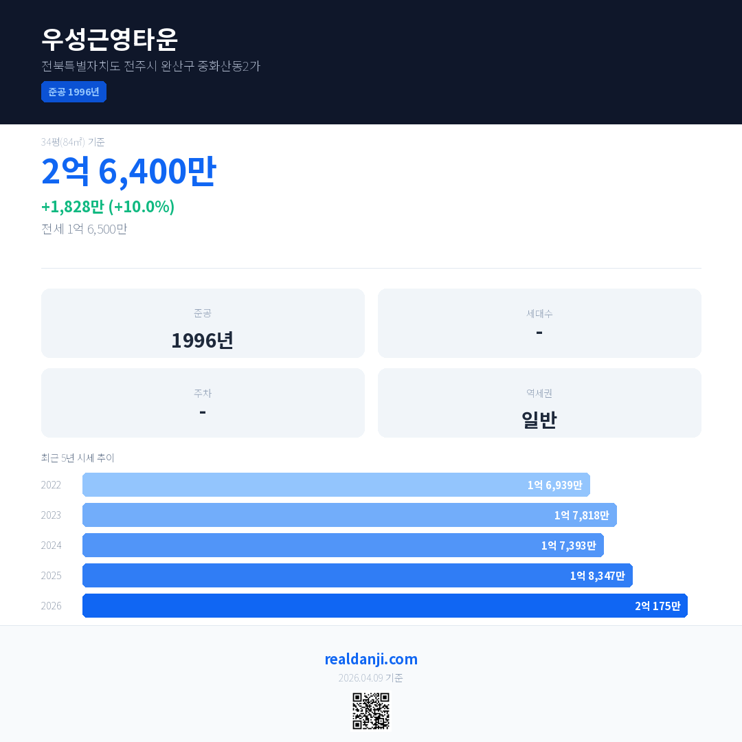 우성근영타운 국민평형 기준 2026년 평균 거래가는 2억 175만으로, 전년 대비 10.0% 상승 했습니다.
