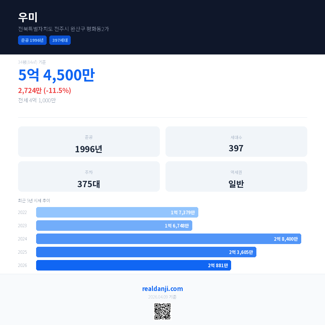 우미은(는) 1996년에 준공되었으며, 현재 30년차입니다. 총 397세대 규모입니다.