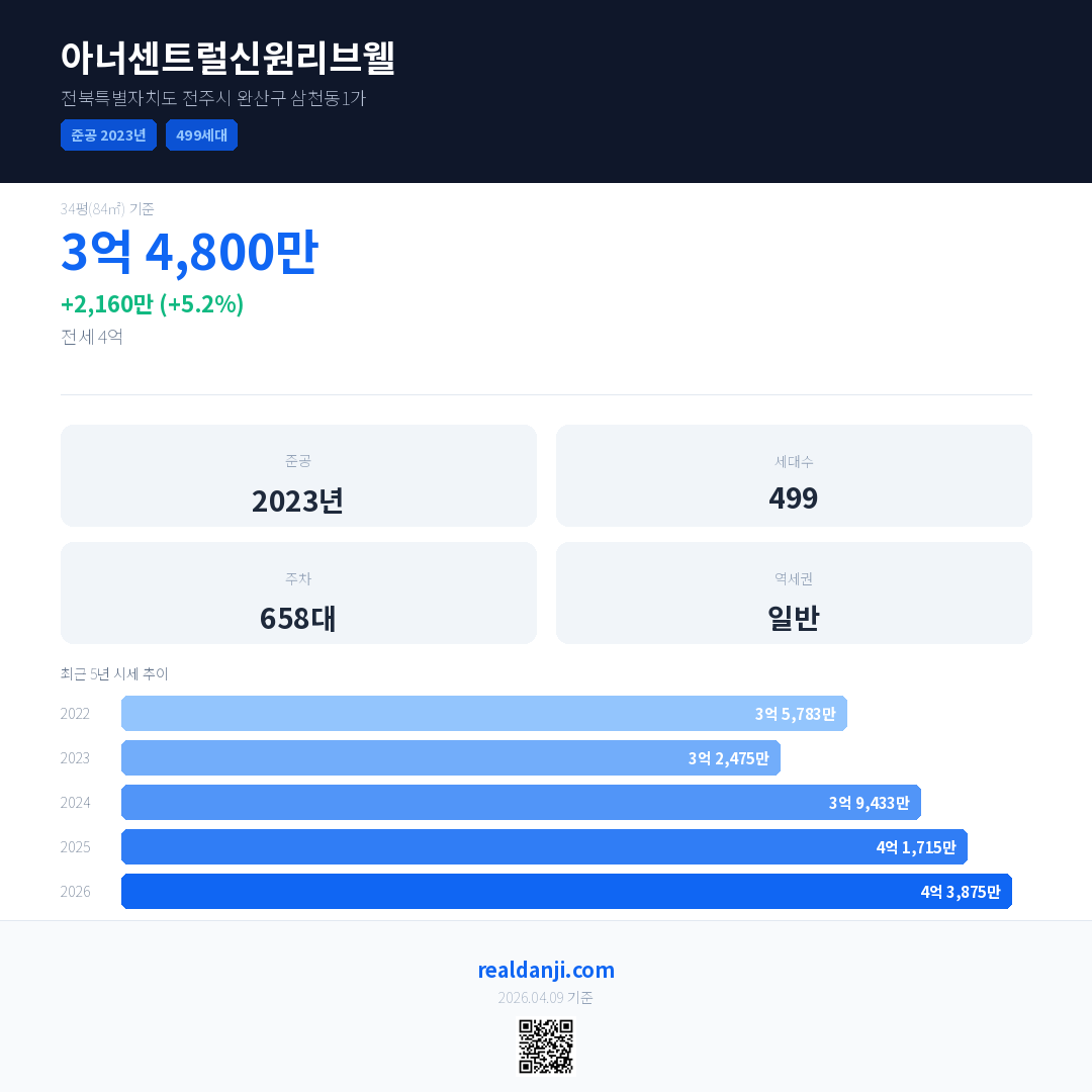 아너센트럴신원리브웰 국민평형 기준 2026년 평균 거래가는 4억 3,875만으로, 전년 대비 5.2% 상승 했습니다.