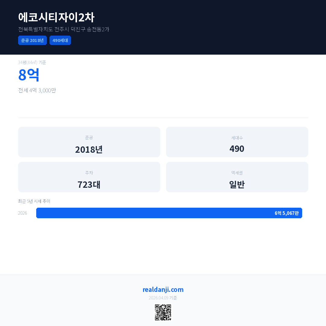 에코시티자이2차은(는) 2018년에 준공되었으며, 현재 8년차입니다. 총 490세대 규모입니다.