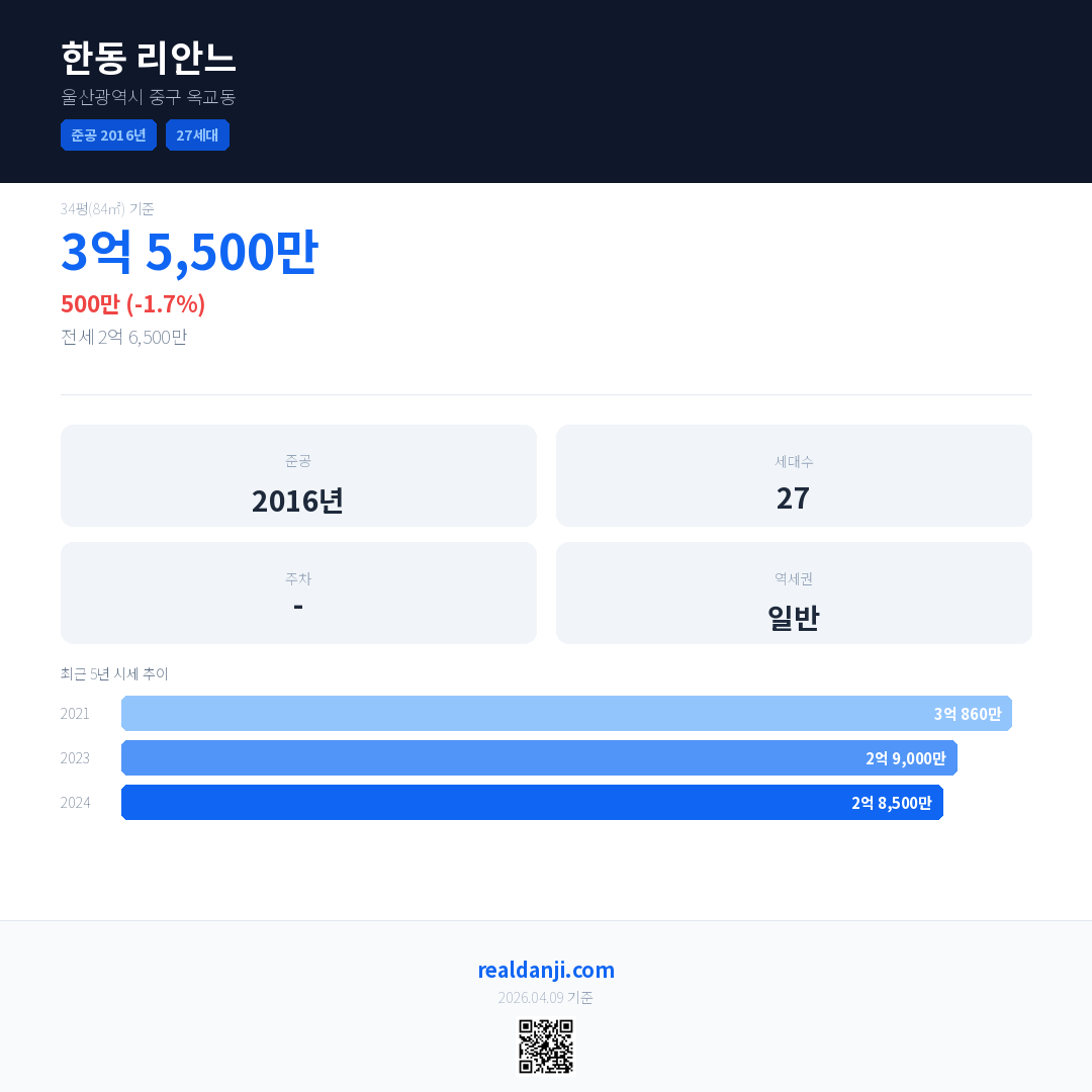 한동 리안느 최근 거래가는 3억 5,500만입니다. (2024-11)