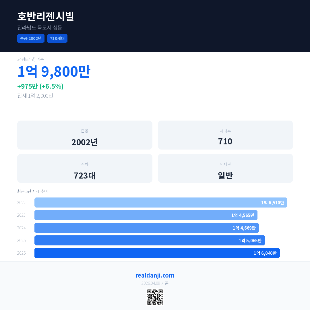 호반리젠시빌 국민평형 기준 2026년 평균 거래가는 1억 6,040만으로, 전년 대비 6.5% 상승 했습니다.