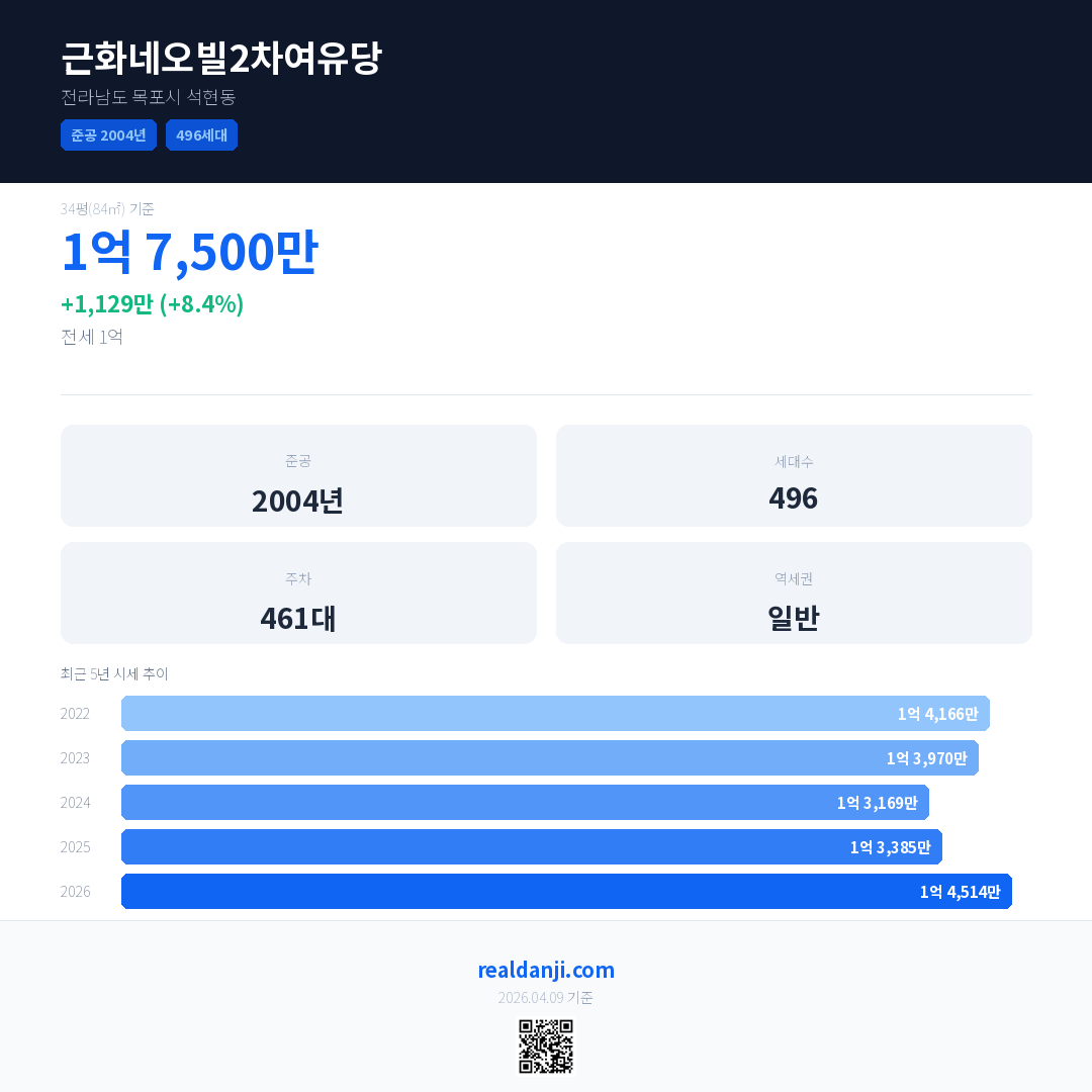 근화네오빌2차여유당 국민평형 기준 2026년 평균 거래가는 1억 4,514만으로, 전년 대비 8.4% 상승 했습니다.