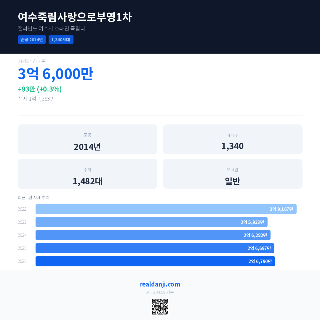 여수죽림사랑으로부영1차 최근 거래가는 3억 6,000만입니다. (2026-03)