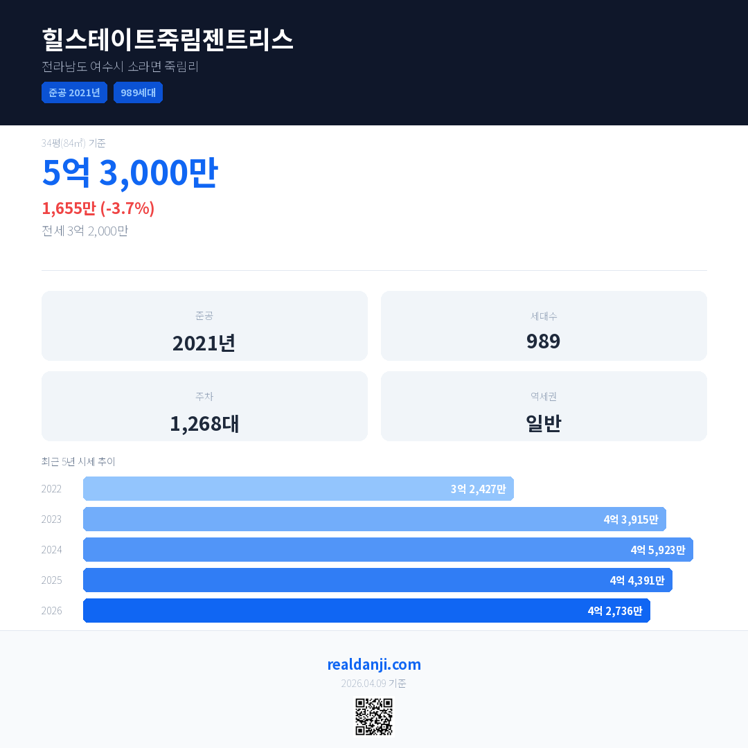 힐스테이트죽림젠트리스은(는) 2021년에 준공되었으며, 현재 5년차입니다. 총 989세대 규모입니다.
