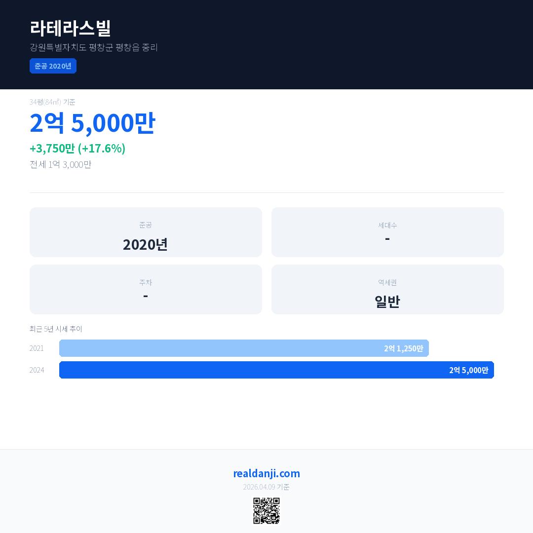 라테라스빌 국민평형 기준 2024년 평균 거래가는 2억 5,000만으로, 전년 대비 17.6% 상승 했습니다.