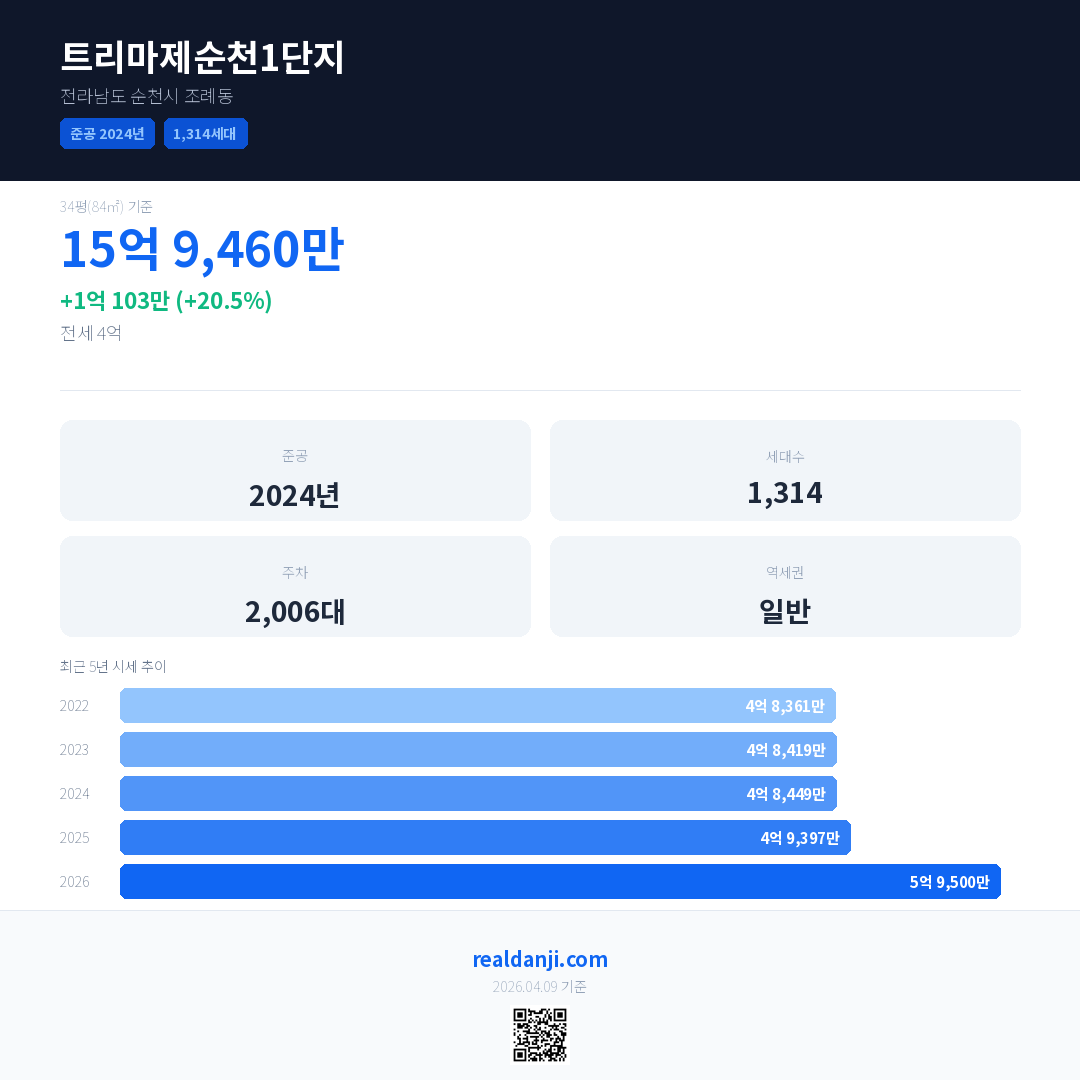 트리마제순천1단지 국민평형 기준 2026년 평균 거래가는 5억 9,500만으로, 전년 대비 20.5% 상승 했습니다.