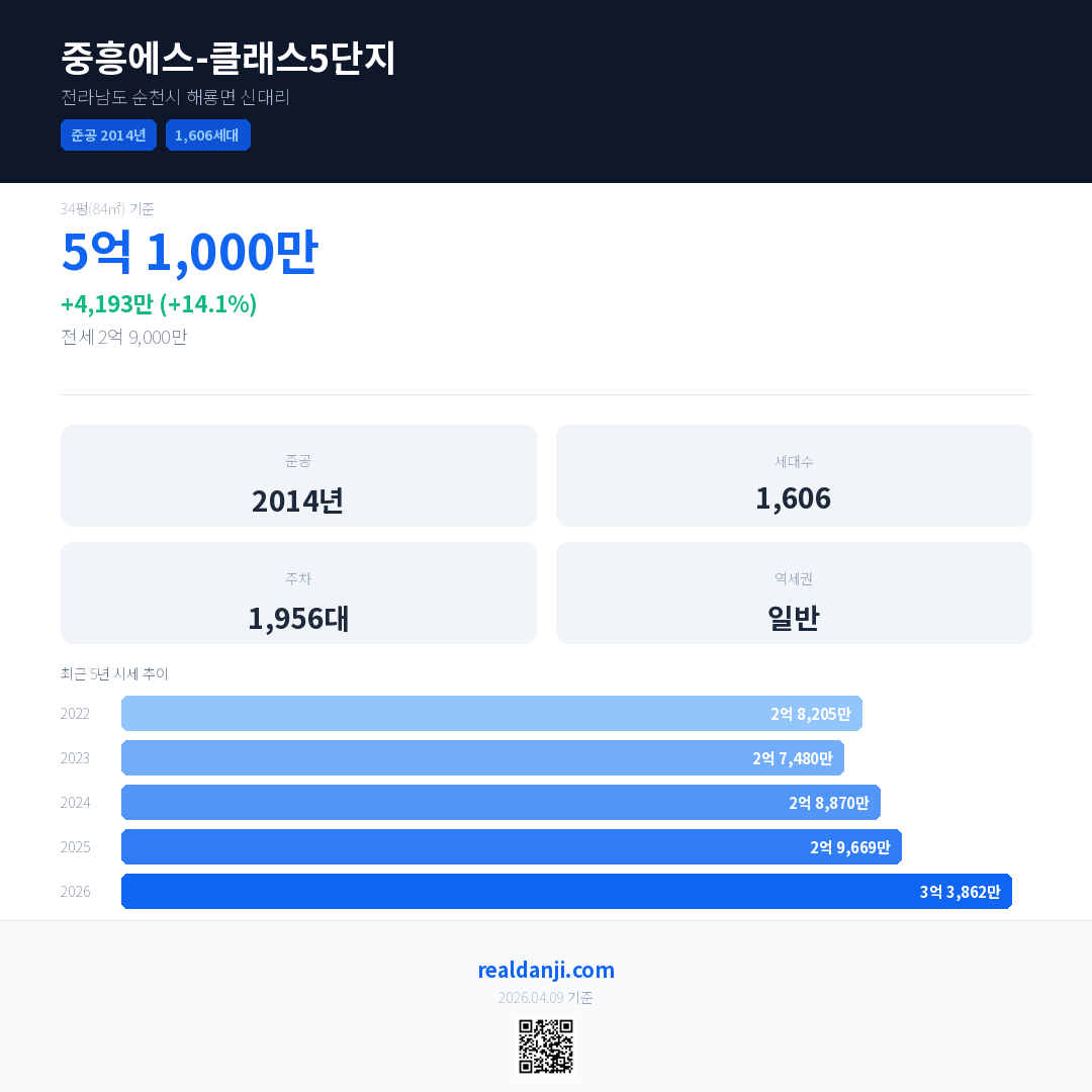 중흥에스-클래스5단지 최근 거래가는 3억 8,500만입니다. (2026-04)