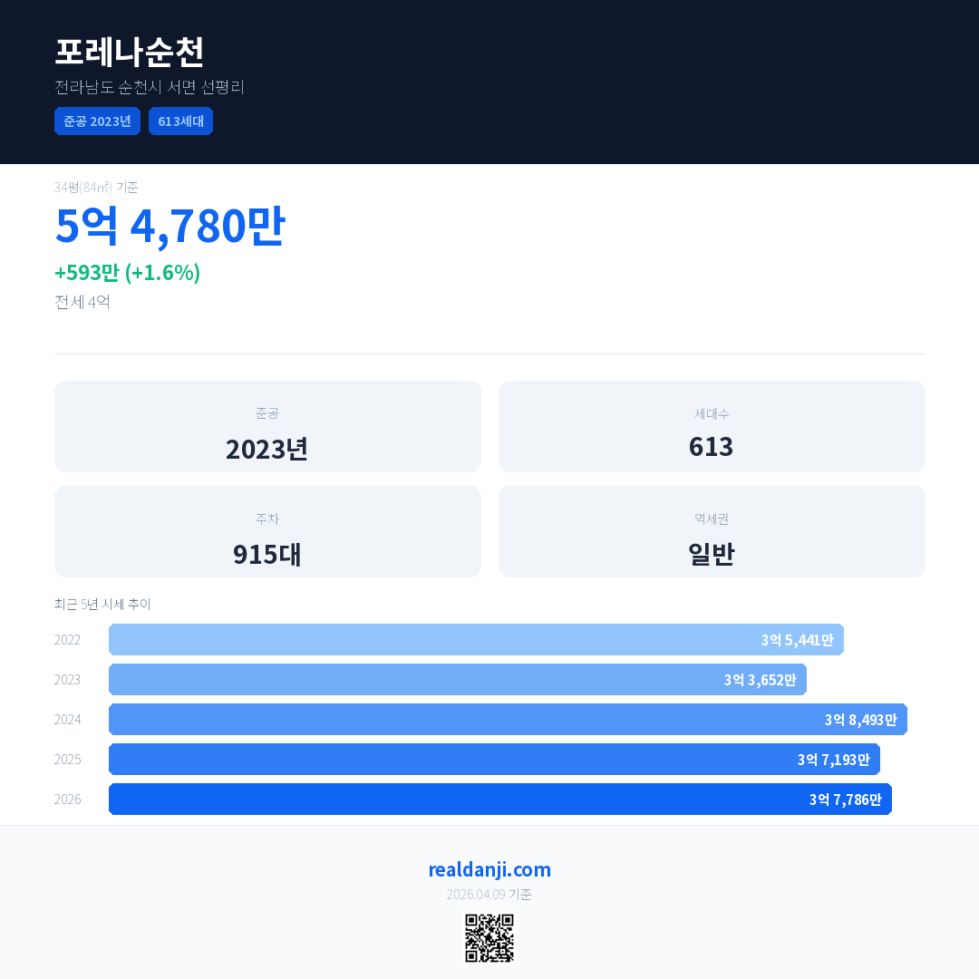 포레나순천 최근 거래가는 5억 4,780만입니다. (2026-03)