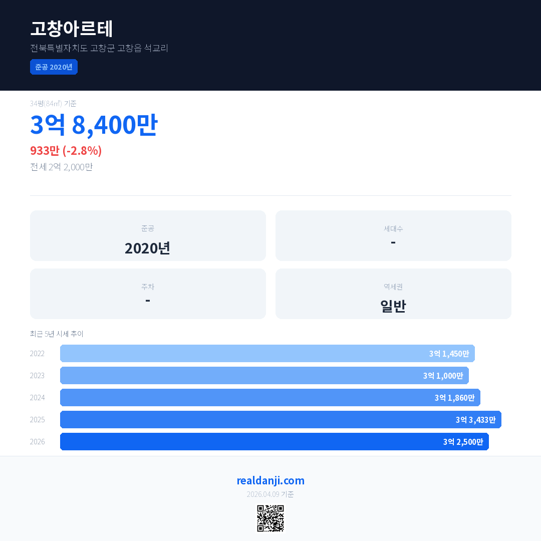 고창아르테 국민평형 기준 2026년 평균 거래가는 3억 2,500만으로, 전년 대비 2.8% 하락 했습니다.