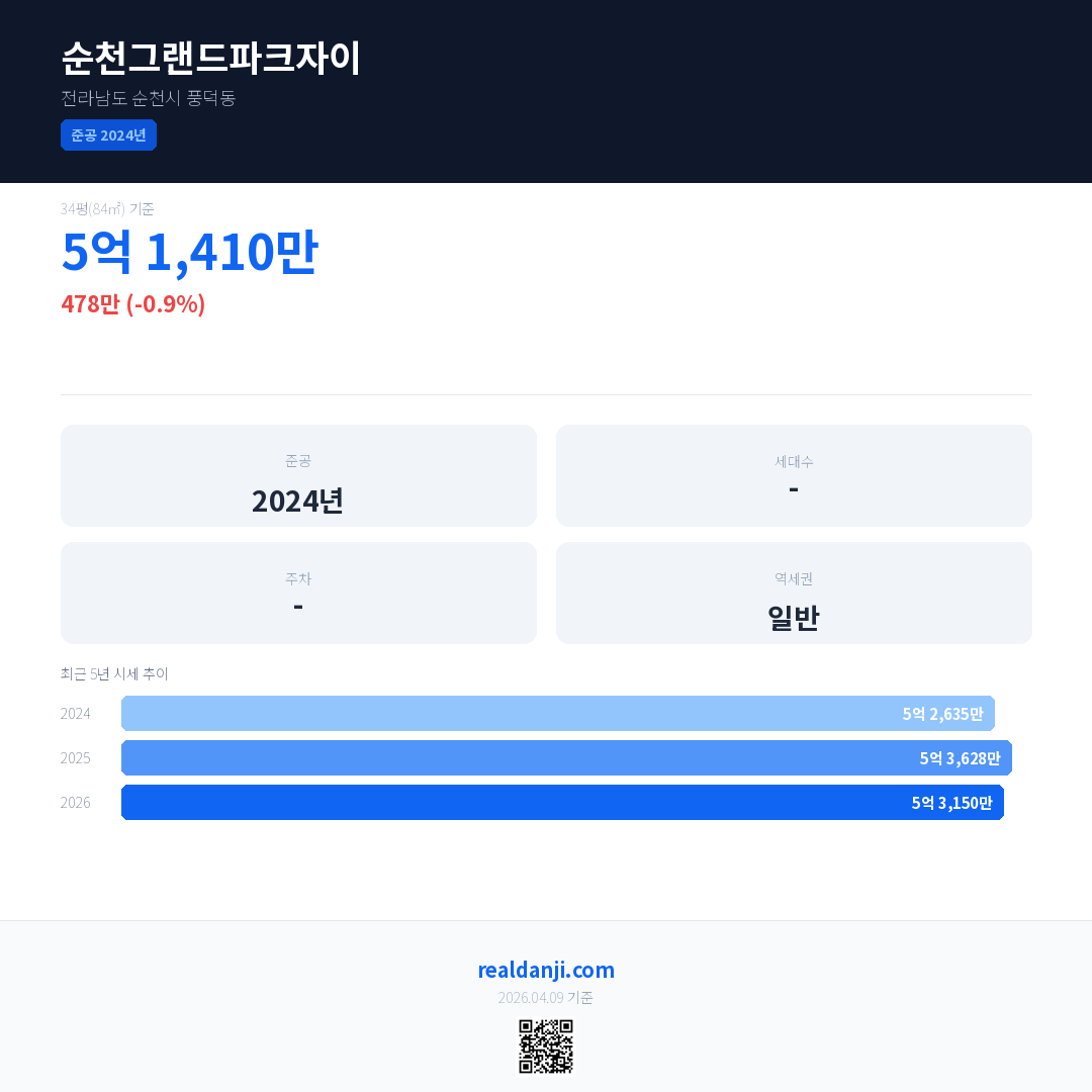 순천그랜드파크자이 최근 거래가는 5억 1,410만입니다. (2026-04)