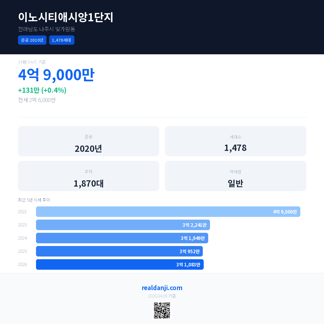 이노시티애시앙1단지 국민평형 기준 2026년 평균 거래가는 3억 1,083만으로, 전년 대비 0.4% 상승 했습니다.