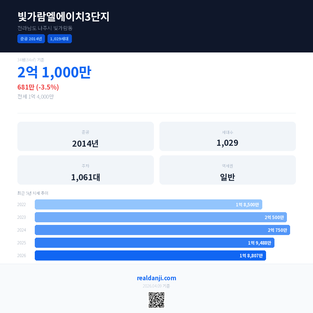 빛가람엘에이치3단지 최근 거래가는 2억 1,000만입니다. (2026-03)