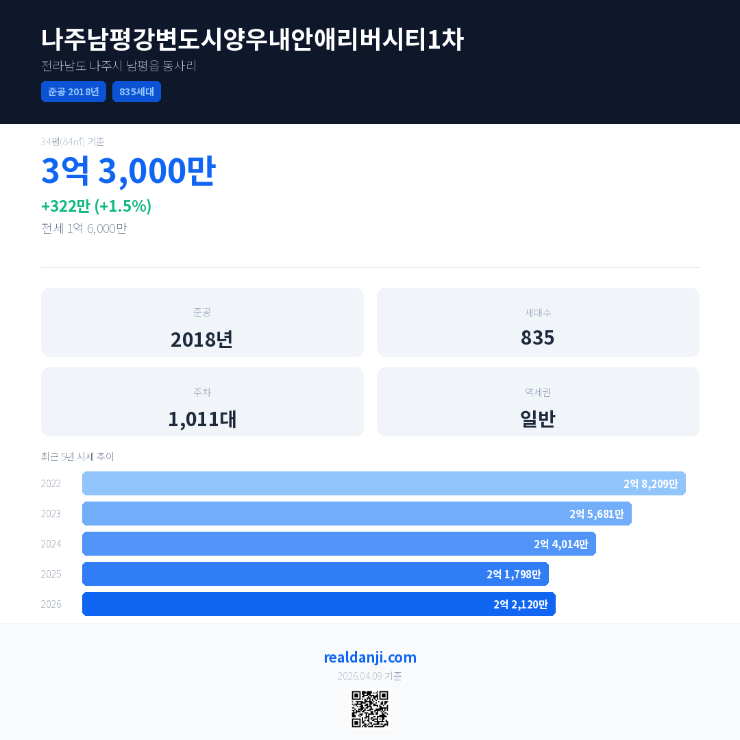 나주남평강변도시양우내안애리버시티1차은(는) 2018년에 준공되었으며, 현재 8년차입니다. 총 835세대 규모입니다.