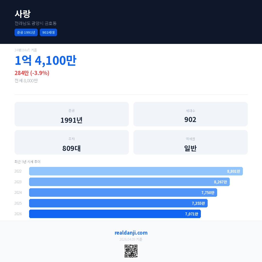 사랑 국민평형 기준 2026년 평균 거래가는 7,071만으로, 전년 대비 3.9% 하락 했습니다.