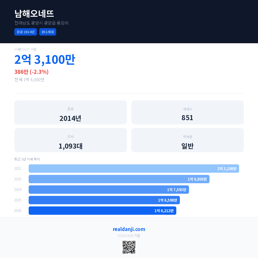 남해오네뜨 국민평형 기준 2026년 평균 거래가는 1억 6,212만으로, 전년 대비 2.3% 하락 했습니다.