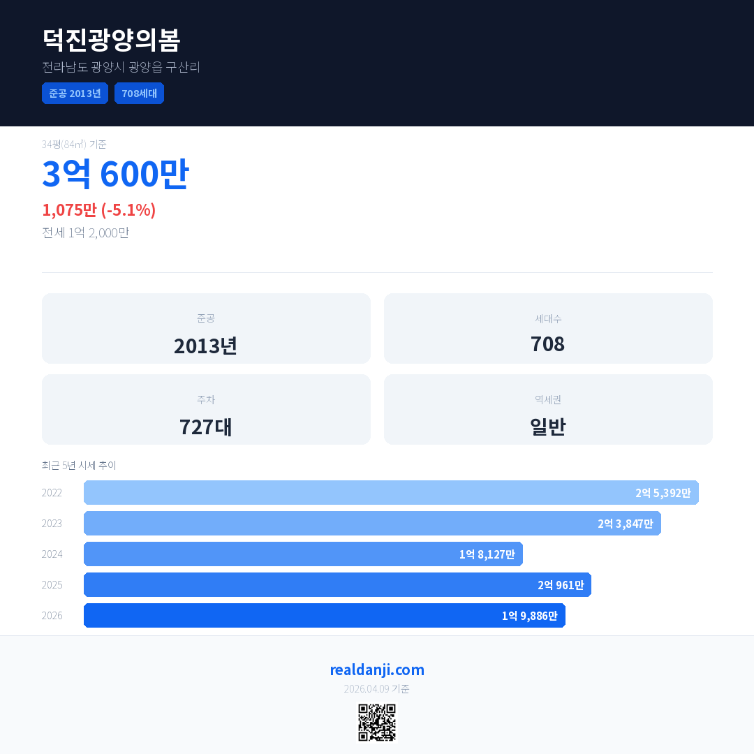 덕진광양의봄 최근 거래가는 3억 600만입니다. (2026-03)