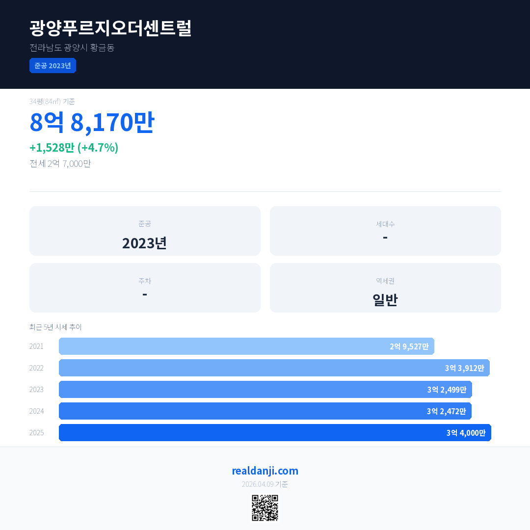 광양푸르지오더센트럴 국민평형 기준 2025년 평균 거래가는 3억 4,000만으로, 전년 대비 4.7% 상승 했습니다.